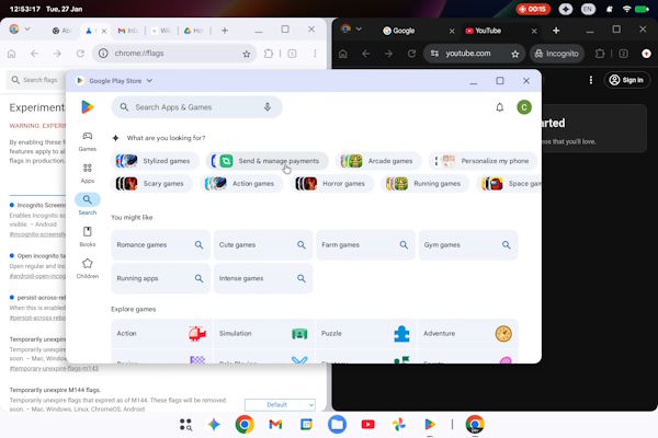 | Seit einigen Monaten sind wir uns sicher: Google will Android und ChromeOS zu einem einzigen Betriebssystem zusammenführen, das auf den Namen „Aluminium OS“ hört. Ende Januar tauchten erste Bildschirmaufnahmen auf, die Google versehentlich selbst in einem Bug-Report geleakt hatte. Zu sehen ist ein HP Elite Dragonfly Chromebook mit Android 16, einer Taskleiste im ChromeOS-Stil, aber mit zentriertem Startbutton wie bei Android, dazu eine Statusleiste am oberen Rand mit den bekannten Android-Icons für Akku und WLAN. Der Play Store läuft ebenfalls. So weit, so unaufregend. | | | |