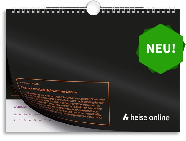 Der heise online Wandkalender 2026: Entdecken Sie die faszinierende Welt der Schwarzen Löcher ‒ ganz ohne Teleskop! Unser neuer Wandkalender präsentiert Ihnen zwölf „spektakuläre Aufnahmen“ dieser kosmischen Phänomene in beeindruckendem Schwarz. Gepaart mit spannenden Fakten begleitet Sie dieser Kalender stilvoll durch das Jahr 2026. Bestellen Sie jetzt Ihr Exemplar im heise shop! | | | |